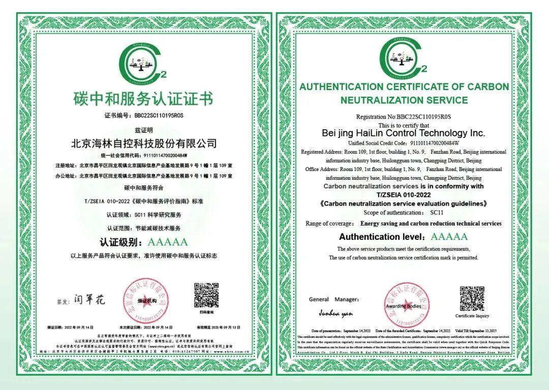 經(jīng)過我司不斷完善、不懈努力,已成功領(lǐng)取“碳中和用戶服務(wù)AAAAA級認(rèn)證證書”,碳中和服務(wù)認(rèn)證分為五個(gè)等級,即A、AA、AAA、AAAA、AAAAA級,等級越高說明企業(yè)綜合實(shí)力和服務(wù)水平越高。此次評審,海林自控榮獲最高級別碳中和服務(wù)認(rèn)證。