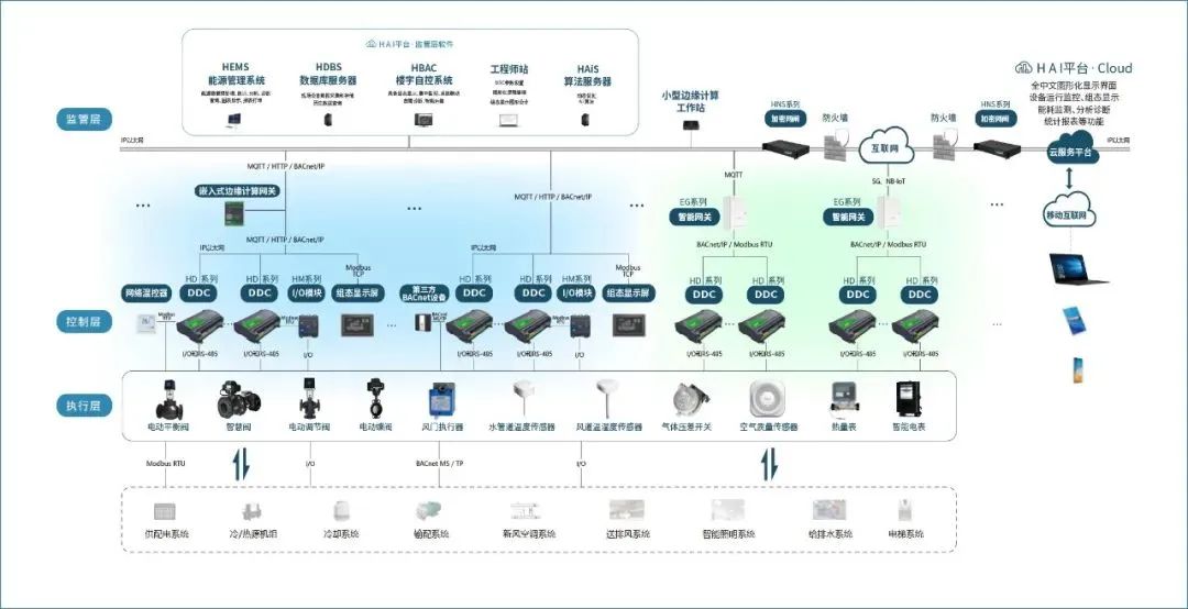 EBA能源樓控系統具體包括Lora無線聯網計量一體型溫控器、智能網關、邊緣計算網絡引擎、IOT-DDC、HAI可視化智慧運營運維運管平臺等明星產品及平臺,智能管控覆蓋暖通空調機房冷熱源設備、水泵等輸配設備以及室內環境側風機盤管等空調設備。