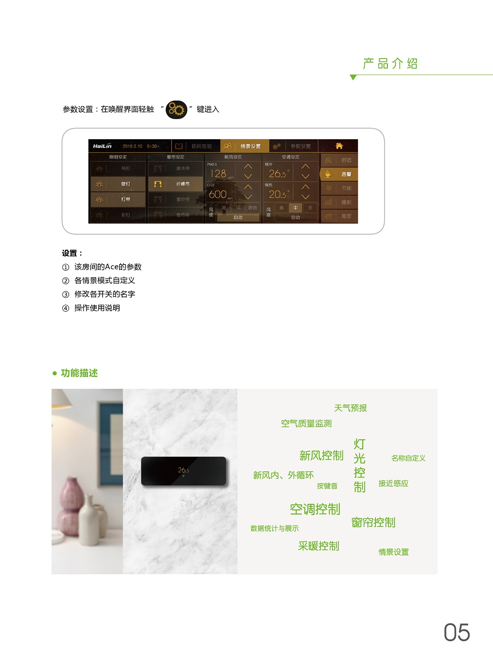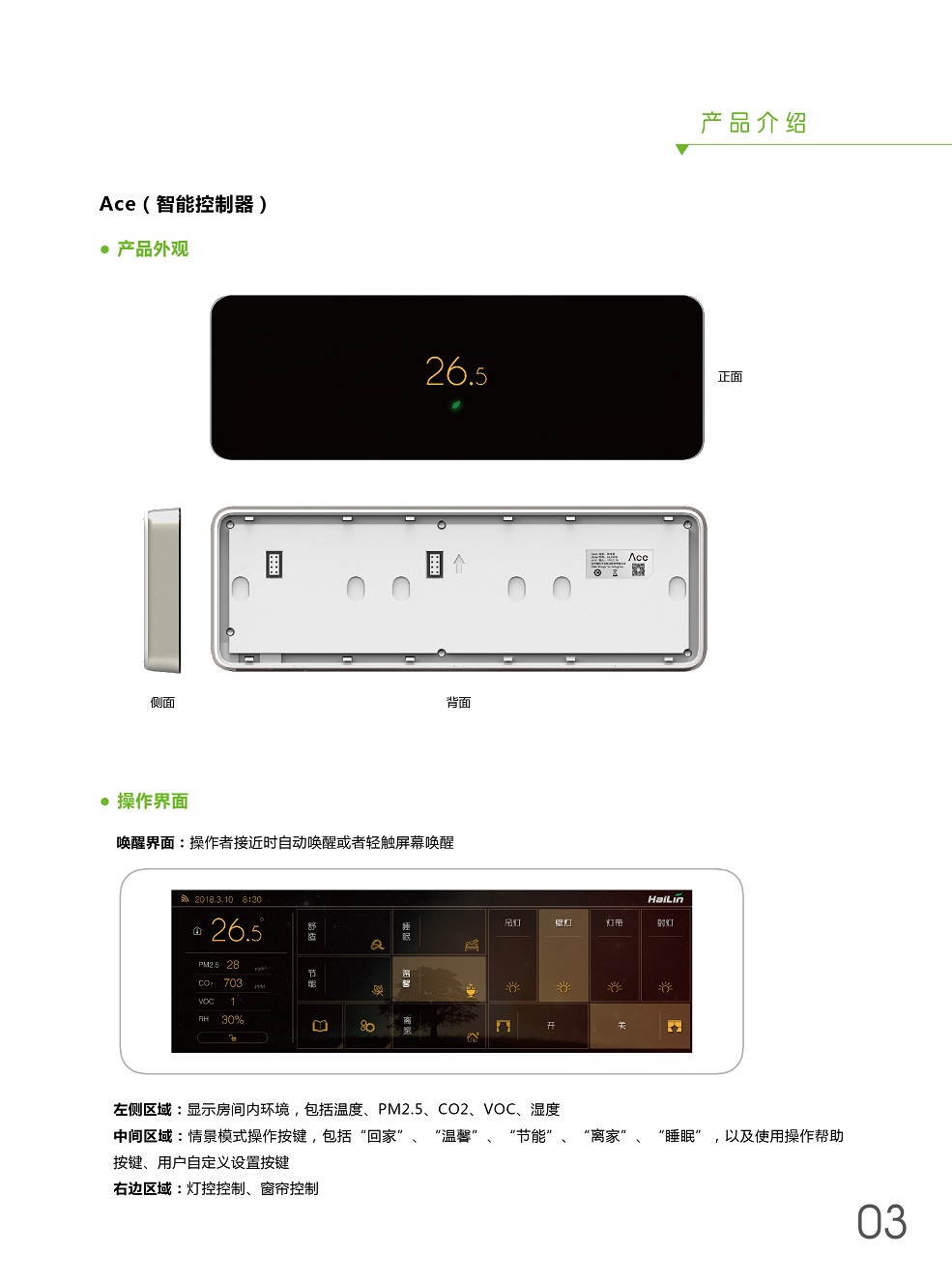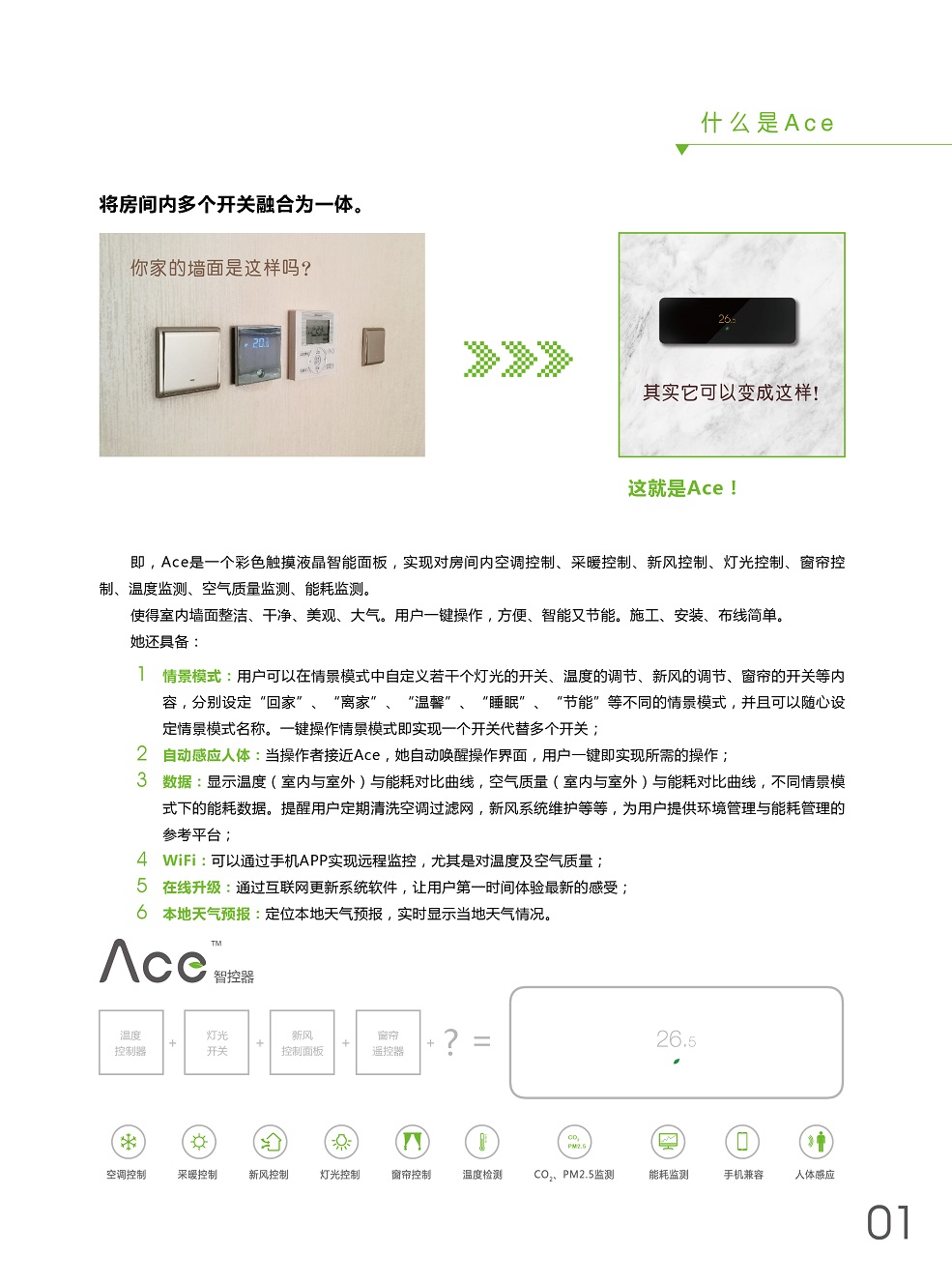 ACE將溫度控制、燈光控制、窗簾控制、新風(fēng)控制、空氣檢測(cè)集于一身,采用控制模塊集中控制,控制面板弱電連接方式,極大程度減少布線及人工成本。ACE+自學(xué)習(xí),不斷優(yōu)化用戶使用習(xí)慣,減少生活浪費(fèi),ACE就是您身邊的隱形管家。